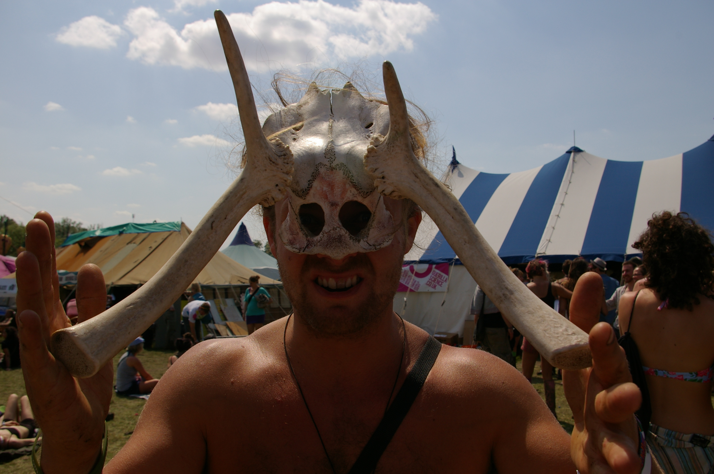 We have tried our skulls on many people’s heads over the summer at festivals, and whilst they are relatively easily held on the top of the head facing forwards with cords threaded around the antlers and through the natural holes (foramina), it is much harder to wear them reversed looking through the artificial ‘eye holes’.
